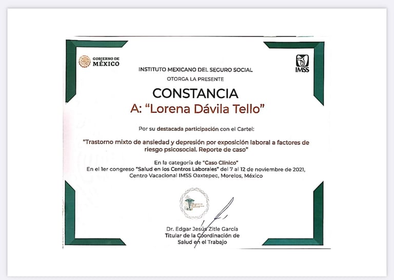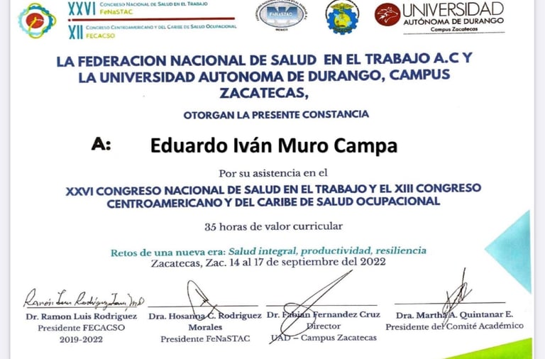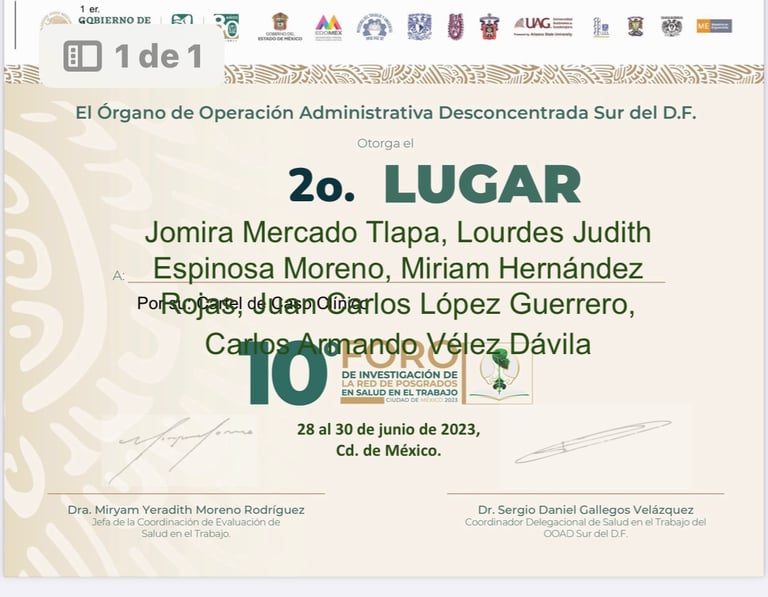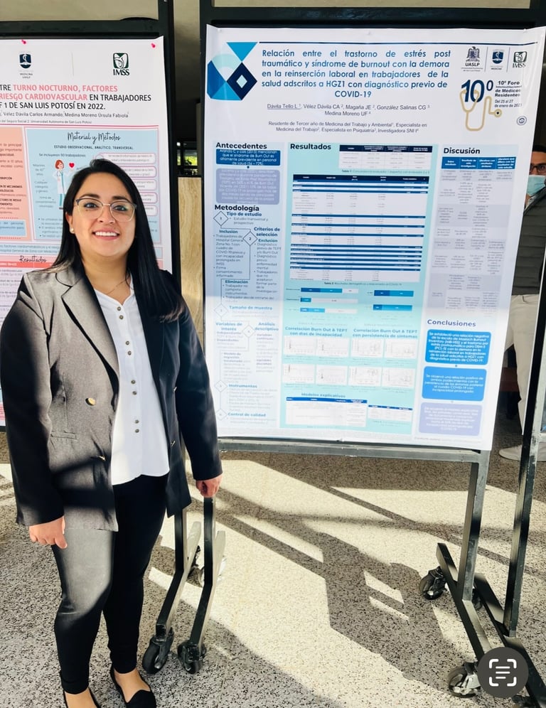 El pasado 13 a 16 de septiembre de 2023 se llevo a cabo en la ciudad de México el XXVII Congreso Nacional de Salud en el Trabajo donde se abordaron actualizaciones importantes en Materia de la Especialidad y la Profesión y donde se presentaron Carteles de Casos Clínicos por parte de los residentes de tercer grado y una alumna de segundo grado. Obteniéndose un Tercer lugar con el trabajo de Investigación : Hipoacusia Neurosensorial como riesgo de trabajo: Reporte de caso. Por lo que felicitamos a los residentes Juan Carlos López Guerrero, Héctor Samuel Flores Medina; así como a los profesores Daniel Hernández Reyes y Carlos Armando Vélez Dávila, pero sobre a todo a la Dra Karla Jaimes Flores quien de manera destacada Presenta el caso.
