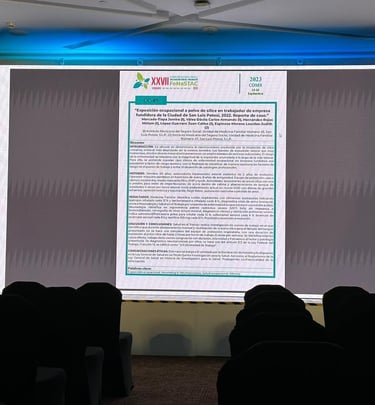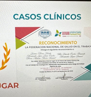 El pasado 13 a 16 de septiembre de 2023 se llevo a cabo en la ciudad de México el XXVII Congreso Nacional de Salud en el Trabajo donde se abordaron actualizaciones importantes en Materia de la Especialidad y la Profesión y donde se presentaron Carteles de Casos Clínicos por parte de los residentes de tercer grado y una alumna de segundo grado. Obteniéndose un Tercer lugar con el trabajo de Investigación : Hipoacusia Neurosensorial como riesgo de trabajo: Reporte de caso. Por lo que felicitamos a los residentes Juan Carlos López Guerrero, Héctor Samuel Flores Medina; así como a los profesores Daniel Hernández Reyes y Carlos Armando Vélez Dávila, pero sobre a todo a la Dra Karla Jaimes Flores quien de manera destacada Presenta el caso.